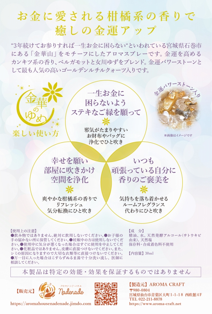 “3年続けてお参りすれば一生お金に困らない”といわれている宮城県石巻市にある「金華山」をモチーフにしたアロマスプレーです。金運を高めるカンキツ系の香り、ベルガモットと女川ゆずをブレンド。金運パワーストーンとして最も人気の高いゴールデンルチルクォーツ入りです。